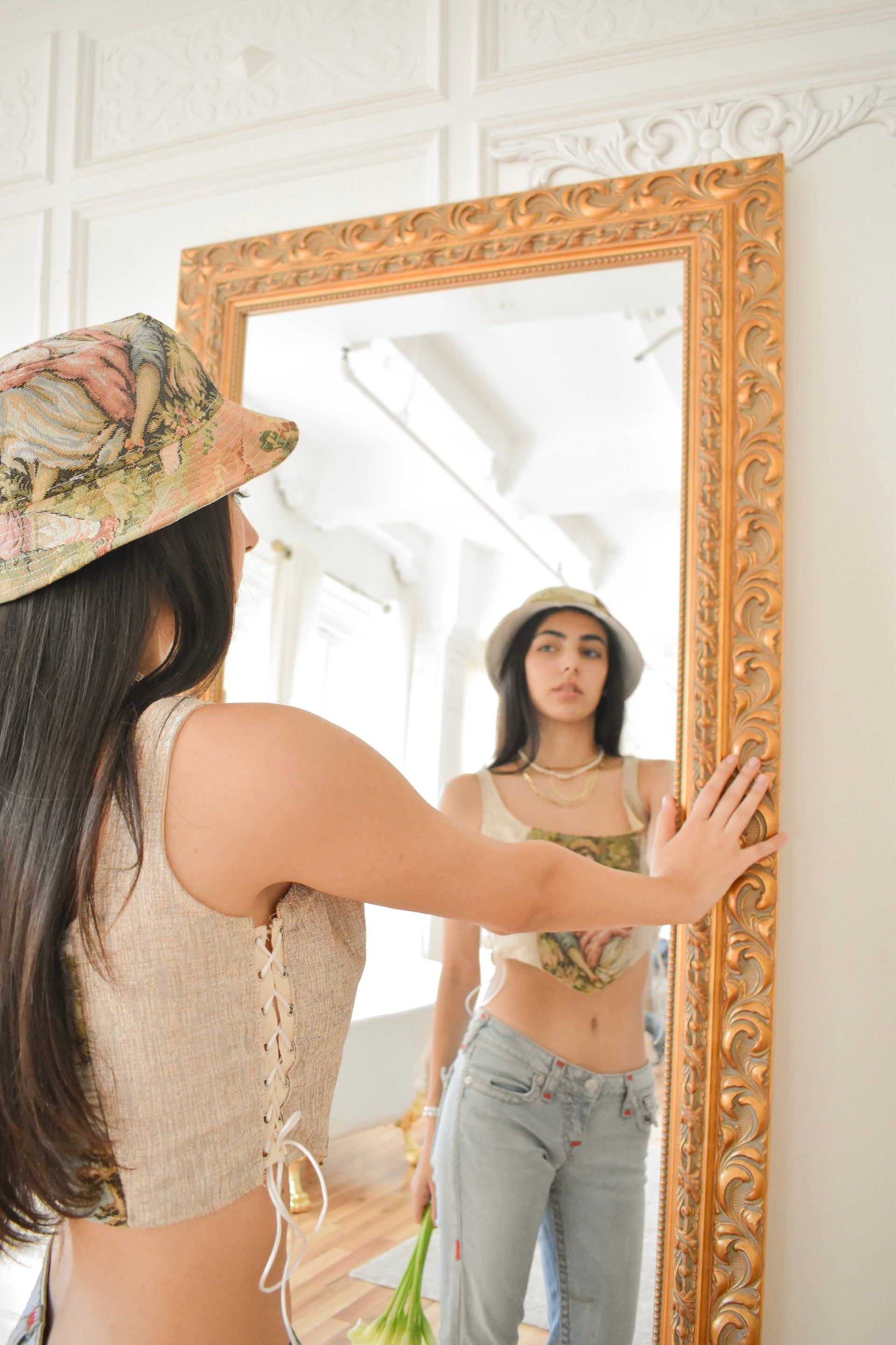 Side Lace-Up Corset hand made out of imported, Italian tapestry and boucle fabric. Lined in 100% silk. Adjustable lace-up detail at side seams, with boning through seams. Hook and eye closure in back.
