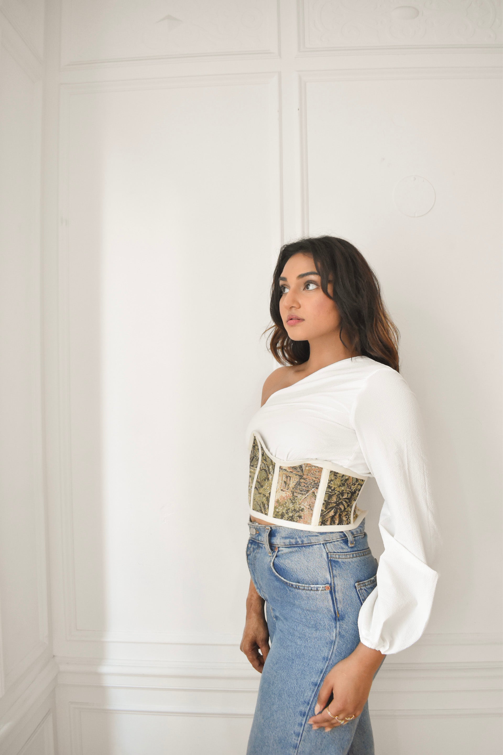 Underbust corset hand made out of imported, Italian tapestry, lined in 100% silk. Adjustable lace-up back, with boning through seams.