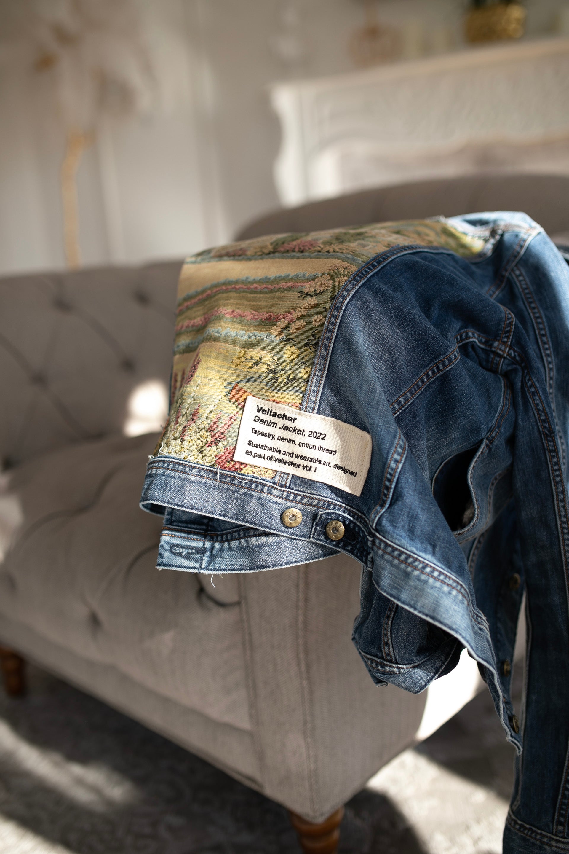 Recycled denim jacket with imported, Italian tapestry back panel. All denim jackets were thrifted to reduce fabric and clothing waste, and feature an embroidered logo and embroidered title card motif.