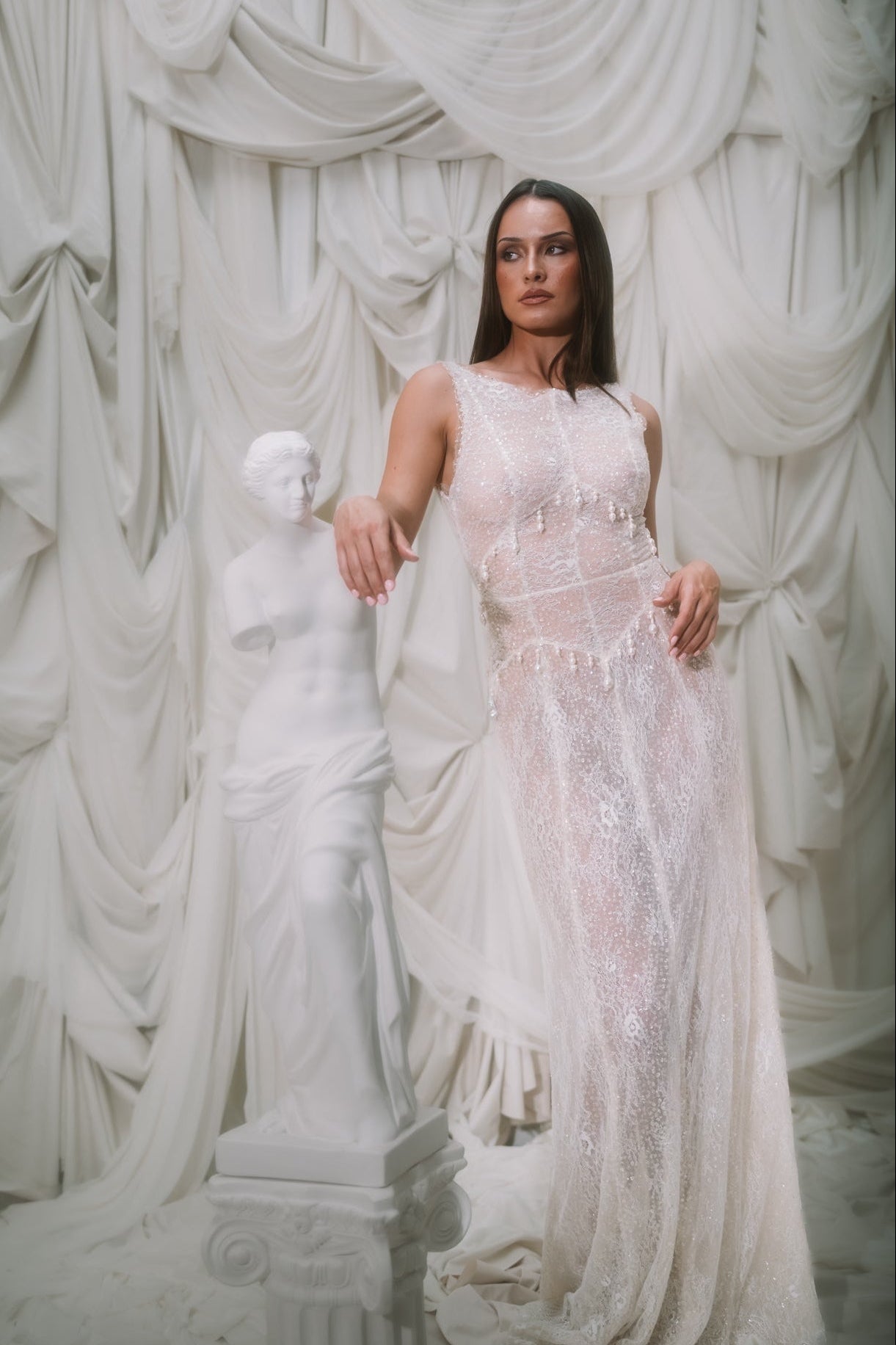 Crafted with intricate detail, this semi sheer, open back gown boasts an intricate combination of Chantilly lace, hand beaded sequin tulle, and dangling freshwater pearls along the front seam lines. The perfect mix of elegance and depth, this dress is ideal for a night out or any bridal event.
