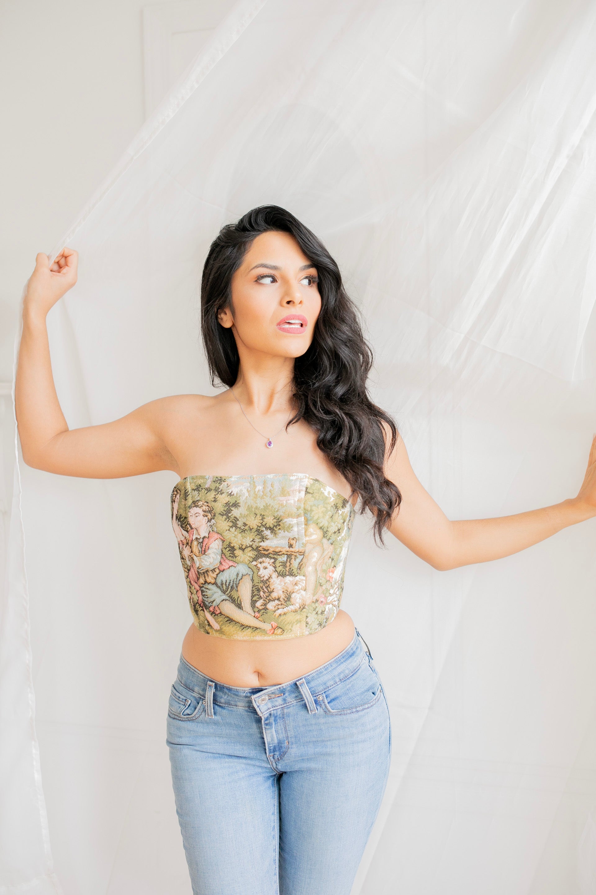 Strapless bustier hand made out of imported, Italian tapestry and lined in 100% silk. Adjustable lace-up back with boning through seams.