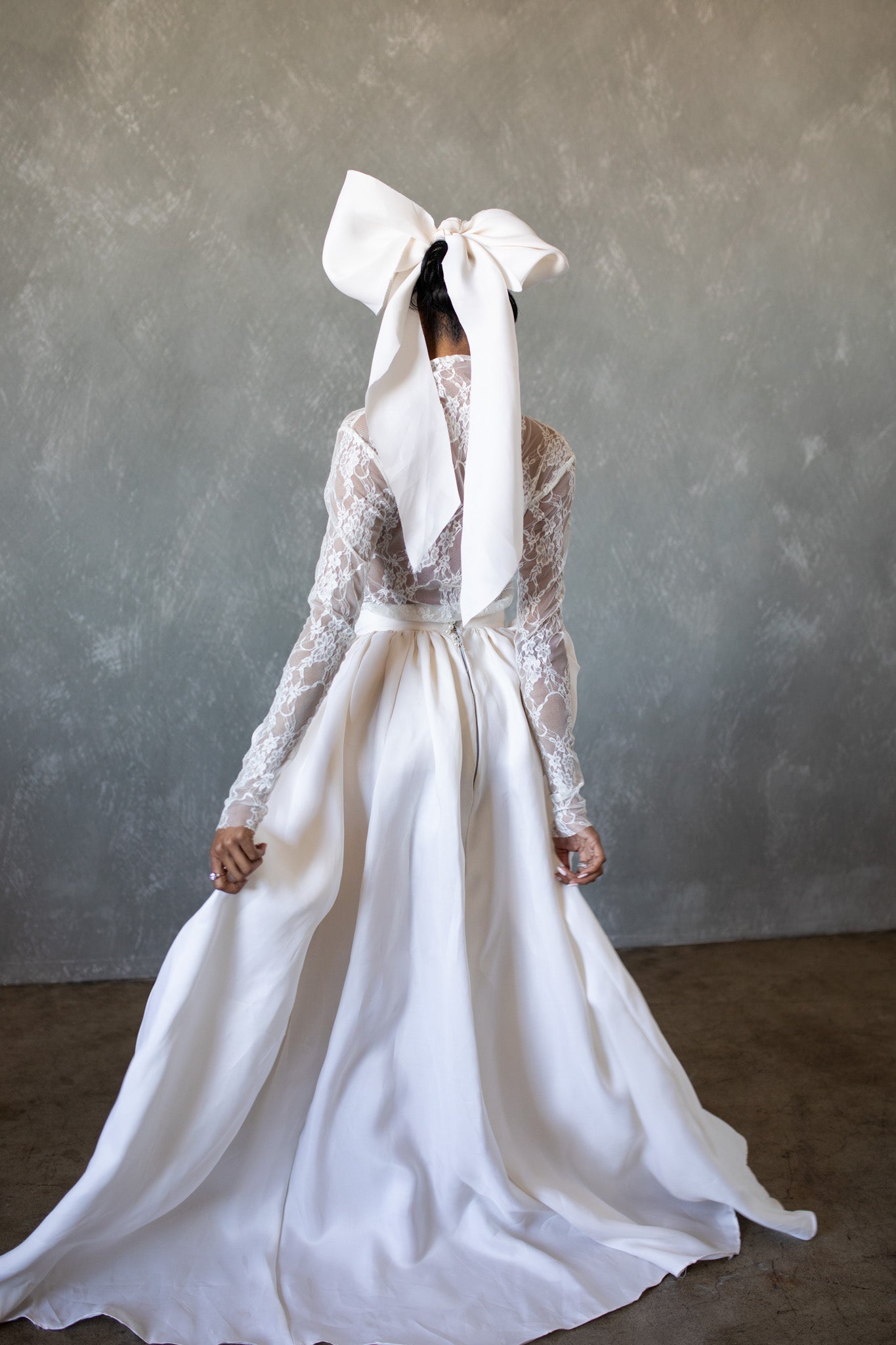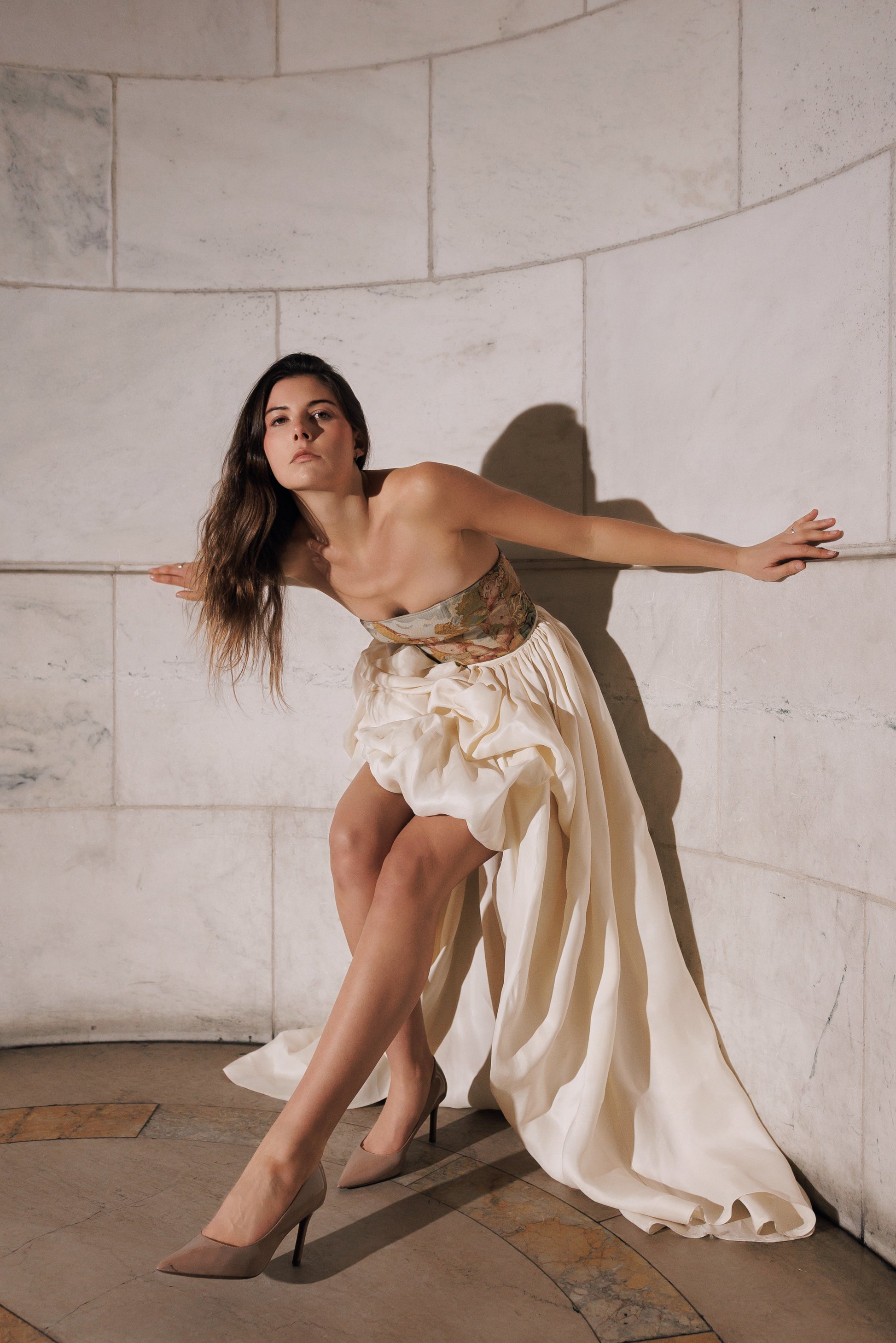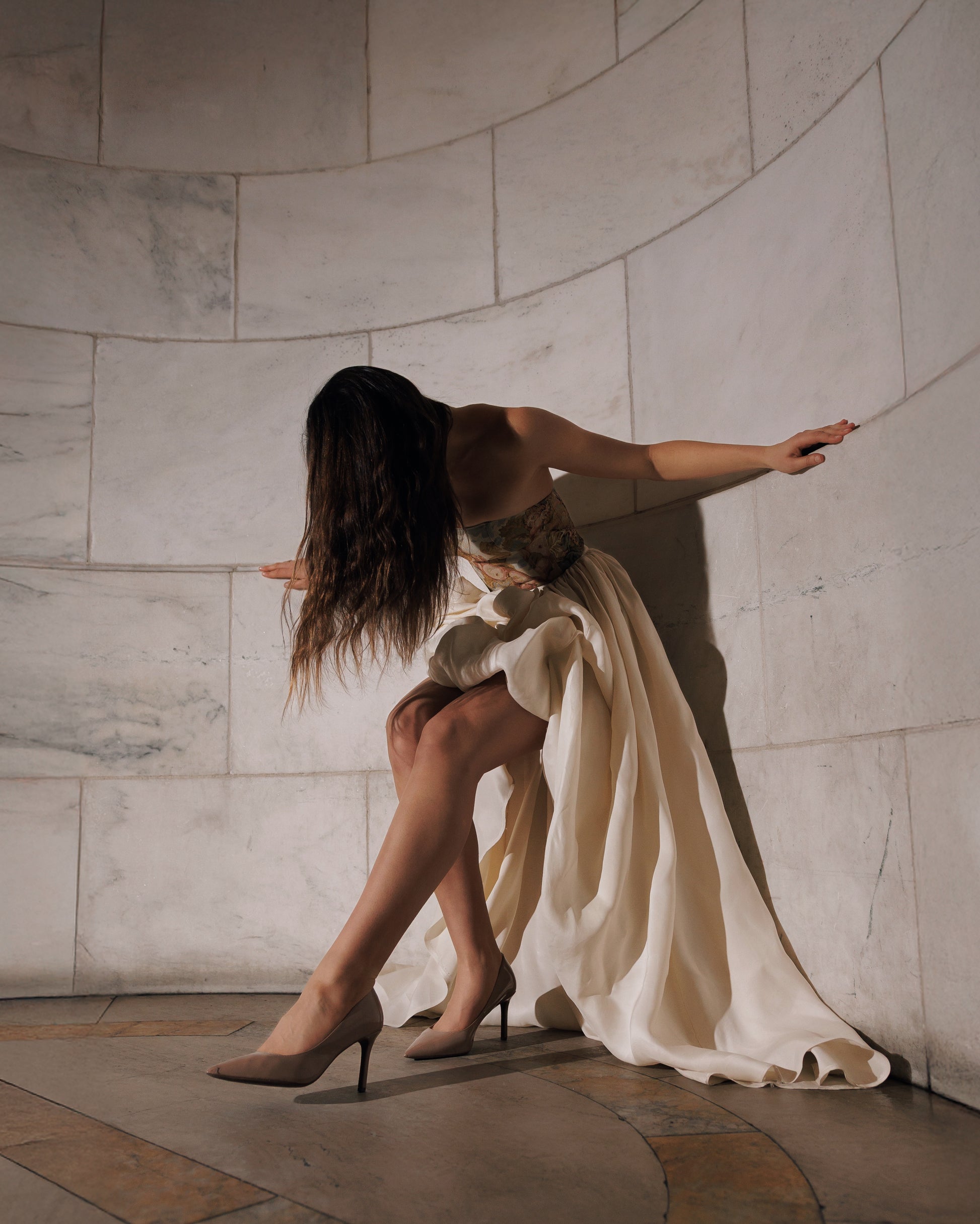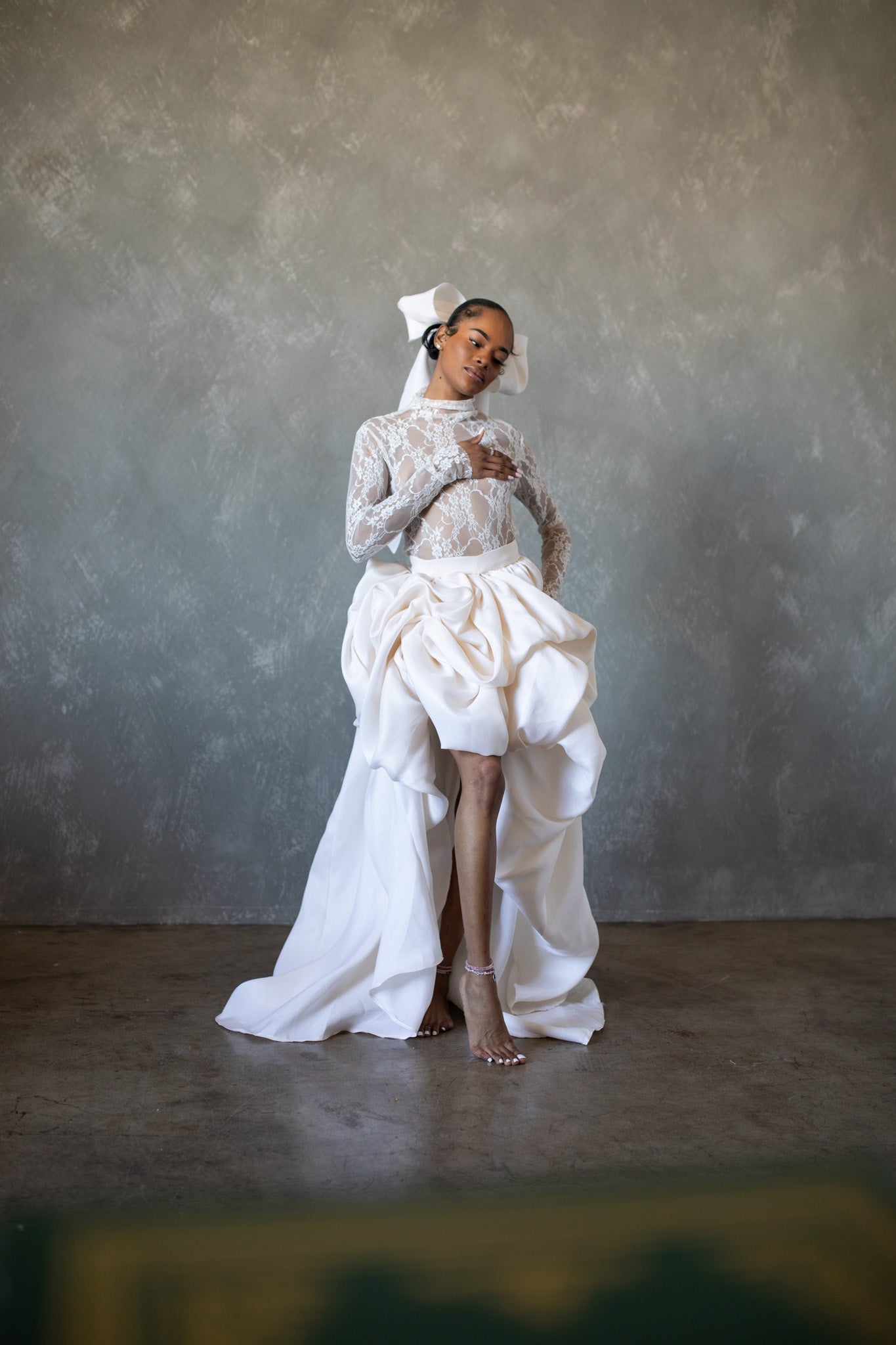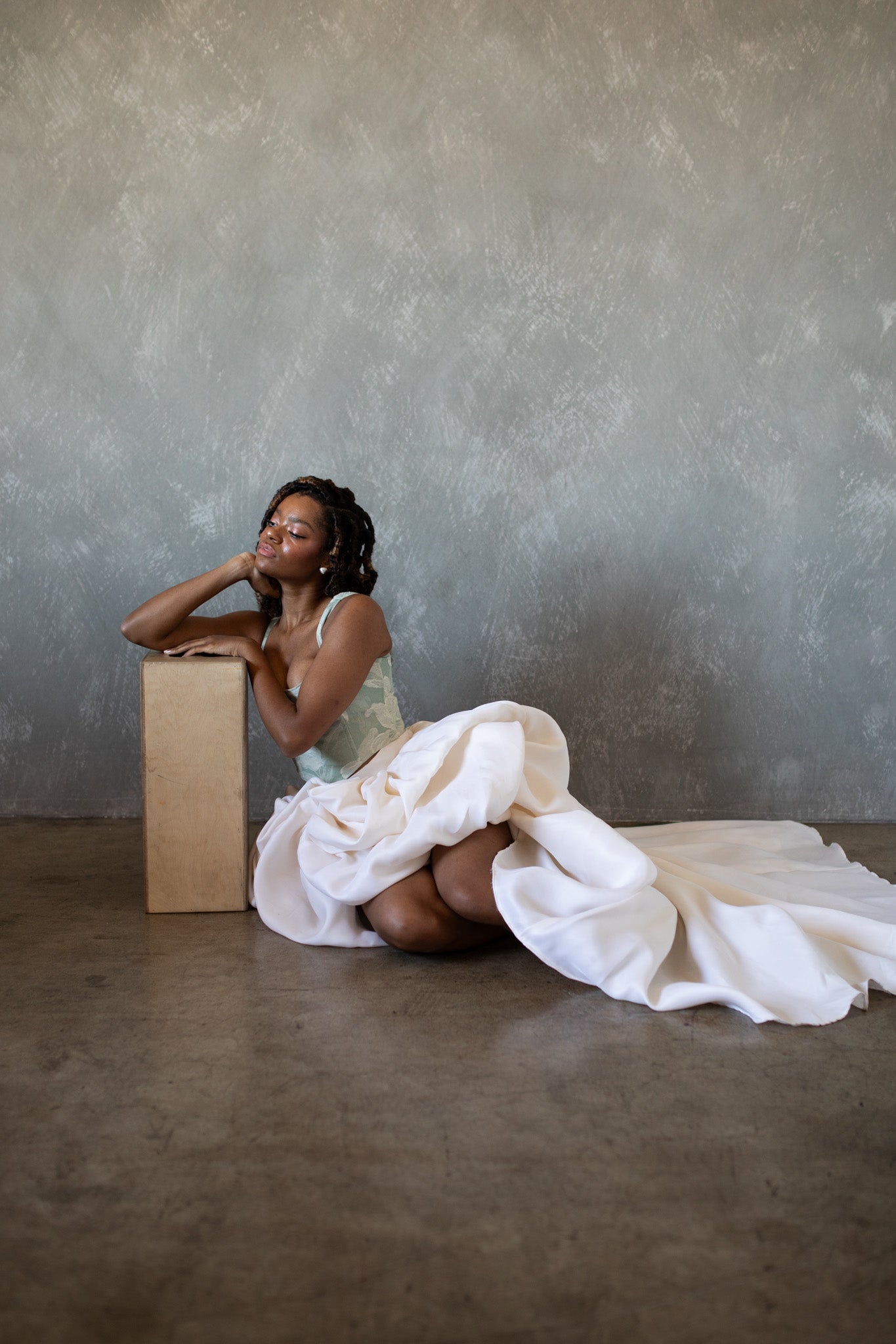 This 100% silk Gazar skirt is created by meticulously pining and hand sewing tucks and pick-ups to create a 3D, skirt that is a sculpture all on its own. Because of the sculpted process we use to create each skirt, please note: all sculpted skirts will be similar, but no two will be exactly the same!