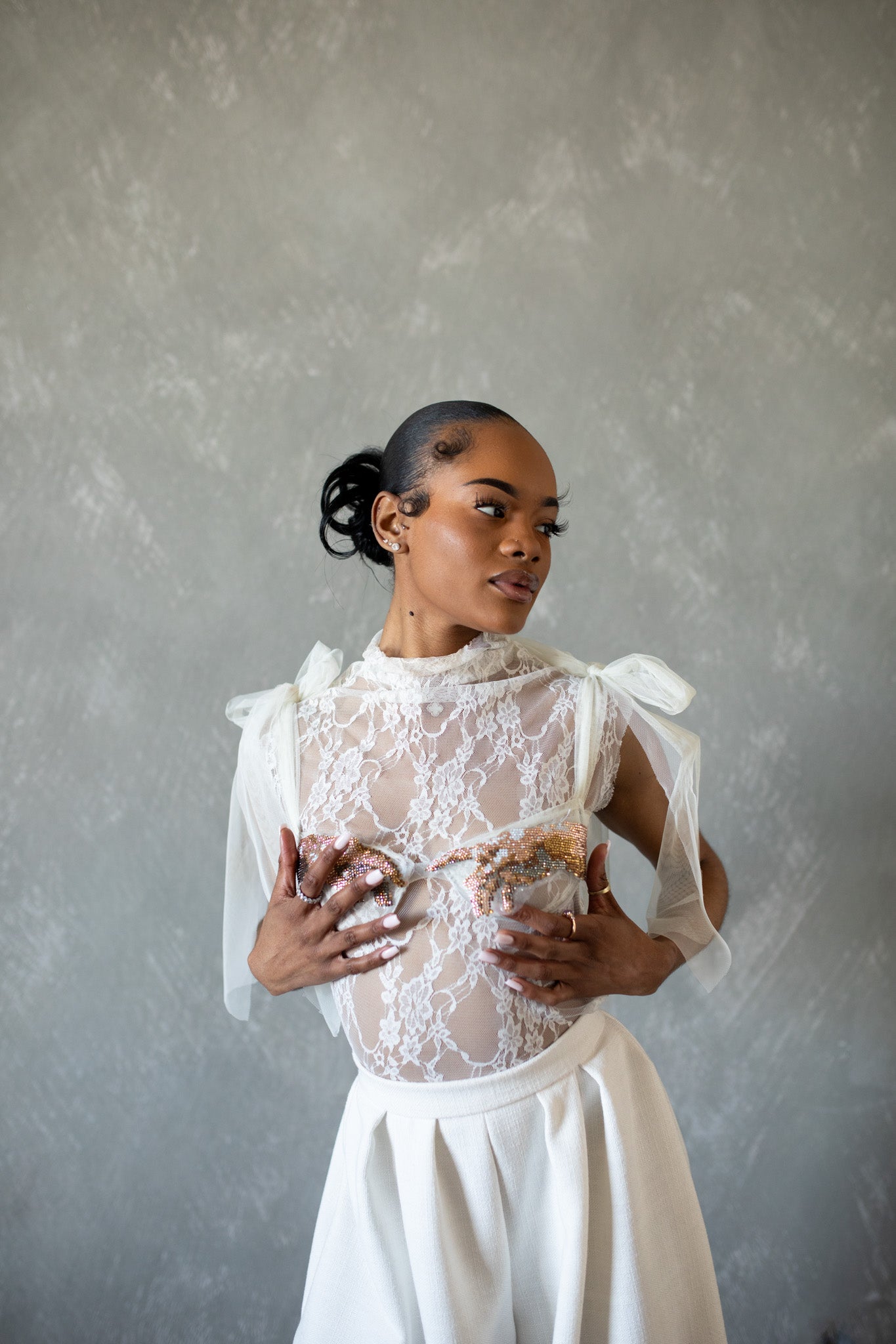 This hand made, fitted, mock neck top made from a delicate stretch lace is the perfect layering piece for any season!