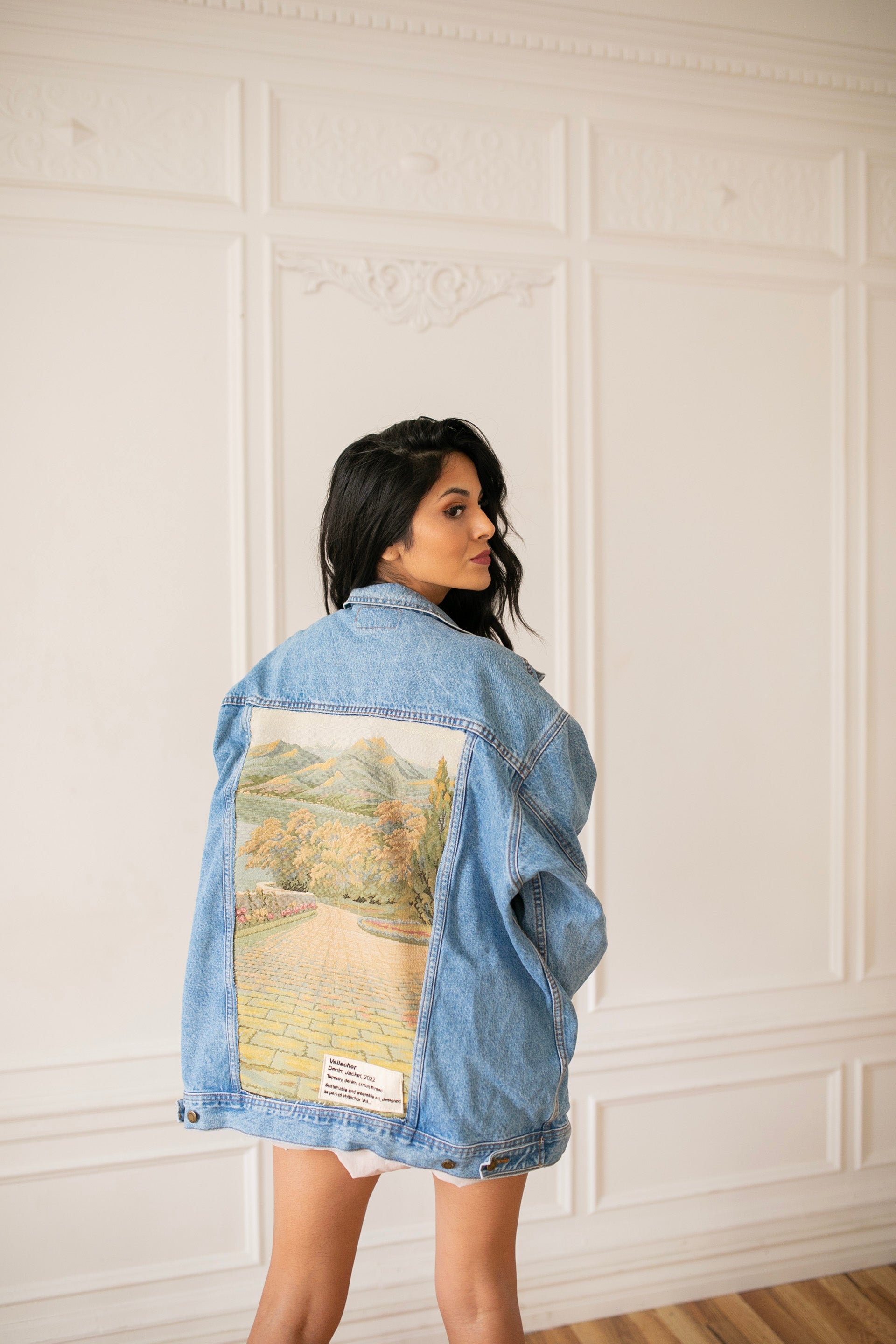Recycled denim jacket with imported, Italian tapestry back panel. All denim jackets were thrifted to reduce fabric and clothing waste, and feature an embroidered logo and embroidered title card motif.