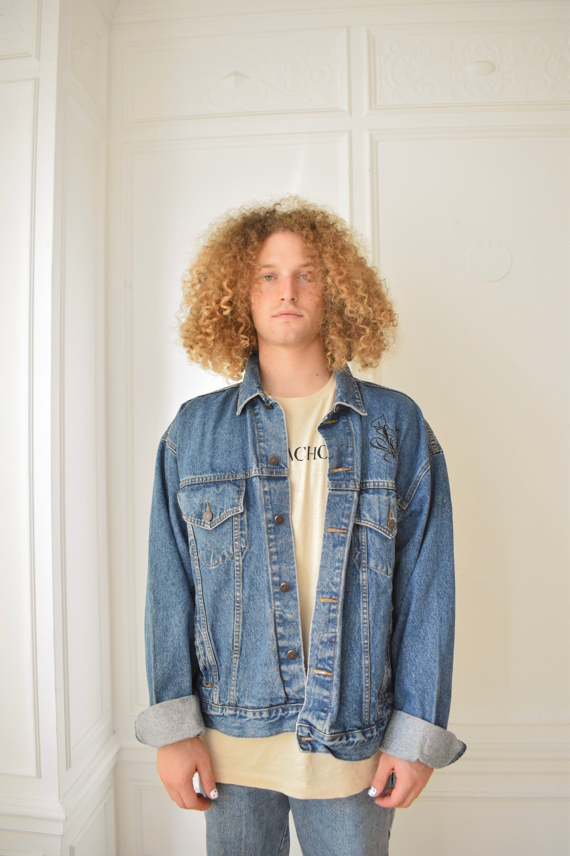 Recycled denim jacket with imported, Italian tapestry back panel. All denim jackets were thrifted to reduce fabric and clothing waste, and feature an embroidered logo and embroidered title card motif.